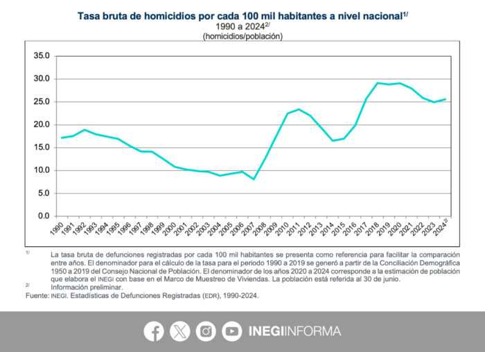 La tasa de homicidios en México ascendió a 25.6 por cada 100 mil habitantes en 2024, con lo que rompió con una racha de tres años consecutivos de reducción, e incluyó los últimos nueve meses de mandato de Andrés Manuel López Obrador (2018-2024), según informó este viernes el Instituto Nacional de Estadística y Geografía (Inegi).