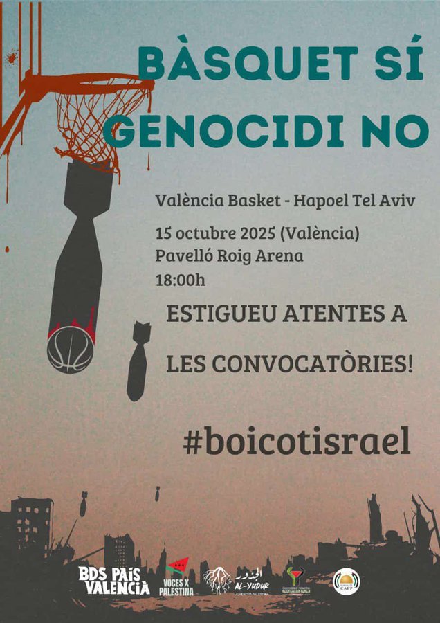 Colectivos contra la actuación de Israel en Palestina han convocado una protesta para este día 15 de octubre frente al Roig Arena con el lema ‘Bàsquet sí, genocidi no’ para defender “el boicot” a Israel y la expulsión de sus equipos de las competiciones europeas.