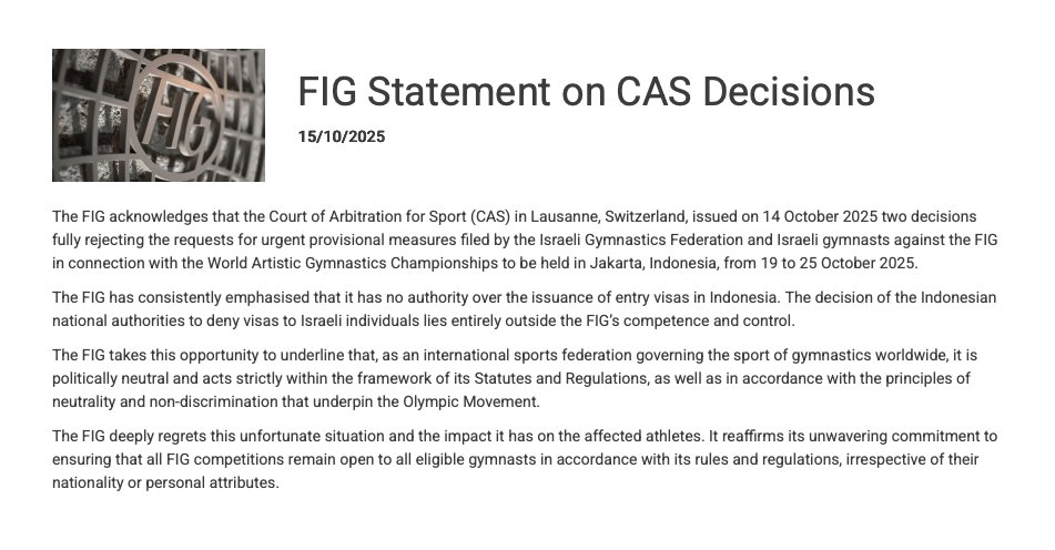 Un día después de que el Tribunal de Arbitraje Deportivo (TAS) rechazara las dos peticiones de medidas urgentes solicitadas contra la decisión de Indonesia por parte de la Federación de Gimnasia de Israel, la FIG reconoció el fallo del TAS y subrayó que “es políticamente neutral y actúa estrictamente dentro del marco de sus Estatutos y Reglamentos”.