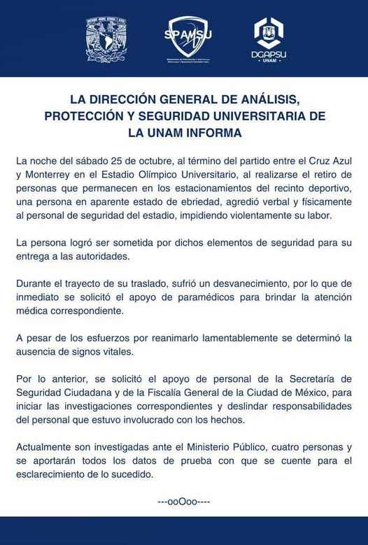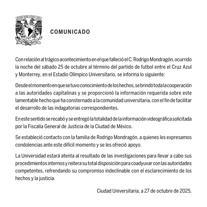 La Universidad Nacional Autónoma de México (UNAM) afirmó que colabora con la Fiscalía de la Ciudad de México para esclarecer la muerte de un aficionado que acudió como espectador al partido entre Cruz Azul Monterrey (2-0), correspondiente a la Fecha 15 del Torneo Apertura 2025 de la Liga MX, celebrado el pasado sábado en el Estadio Olímpico Universitario.
